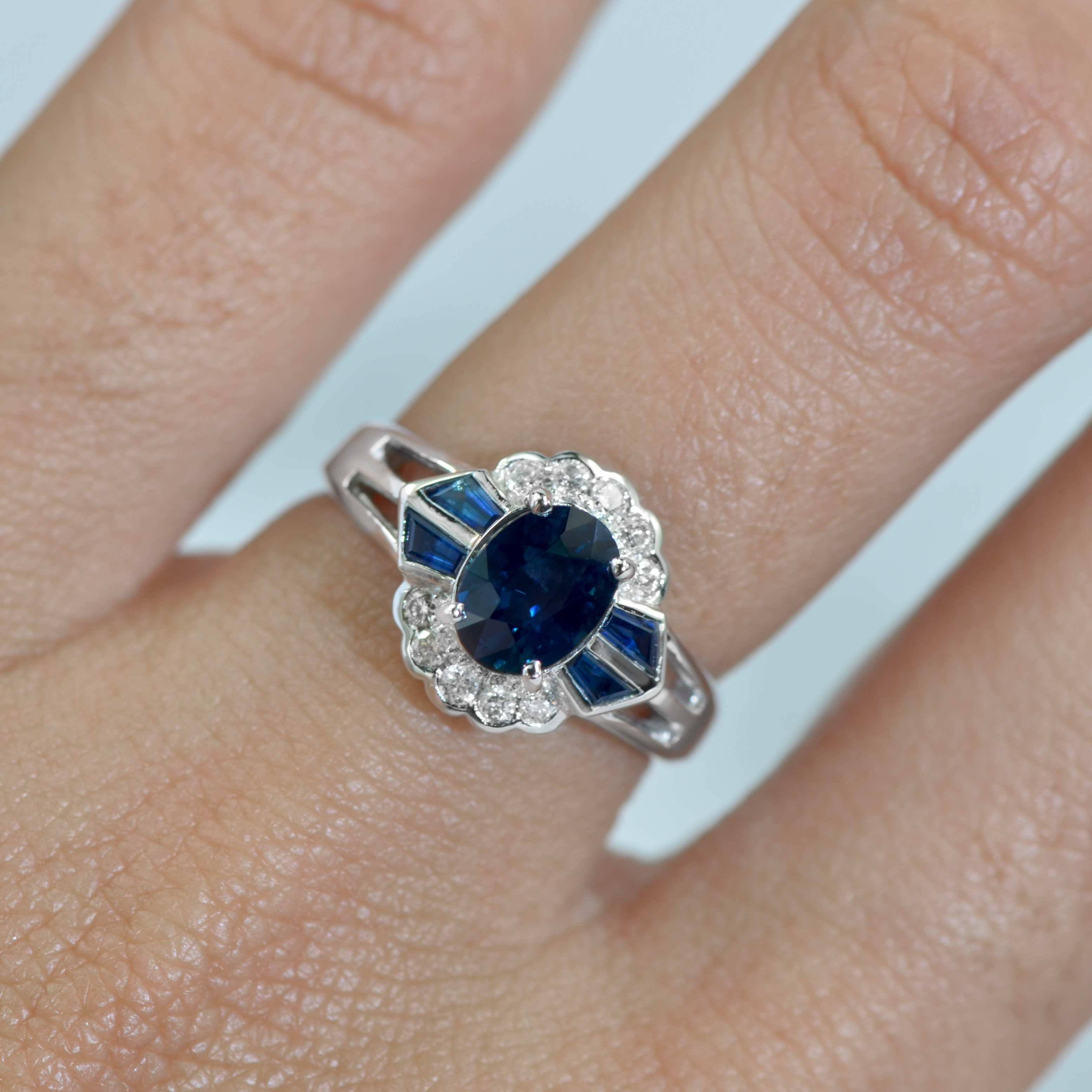 This ring is made of 18k white gold setting with sapphire and diamond. This product is Certified by SuanPhlu.com.