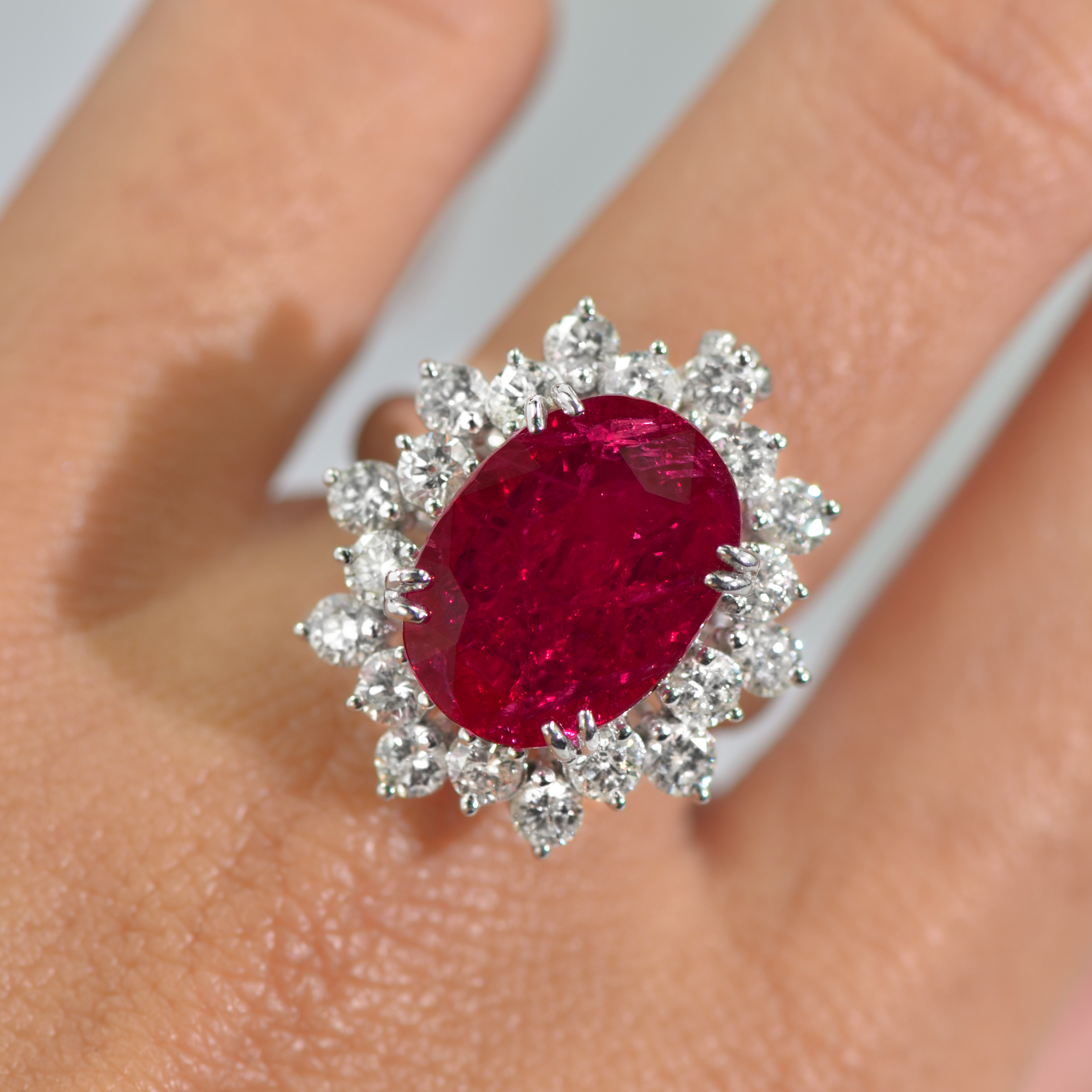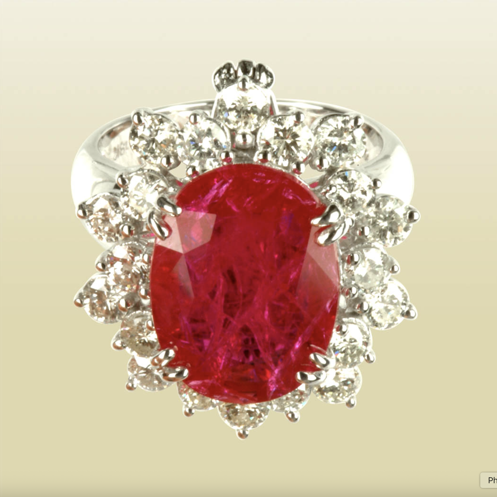 本产品是由18K白金镶嵌天然红宝石和天然钻石制成的红宝石钻石戒指, 并配有萱蒲珠宝出具的品质 保证单。