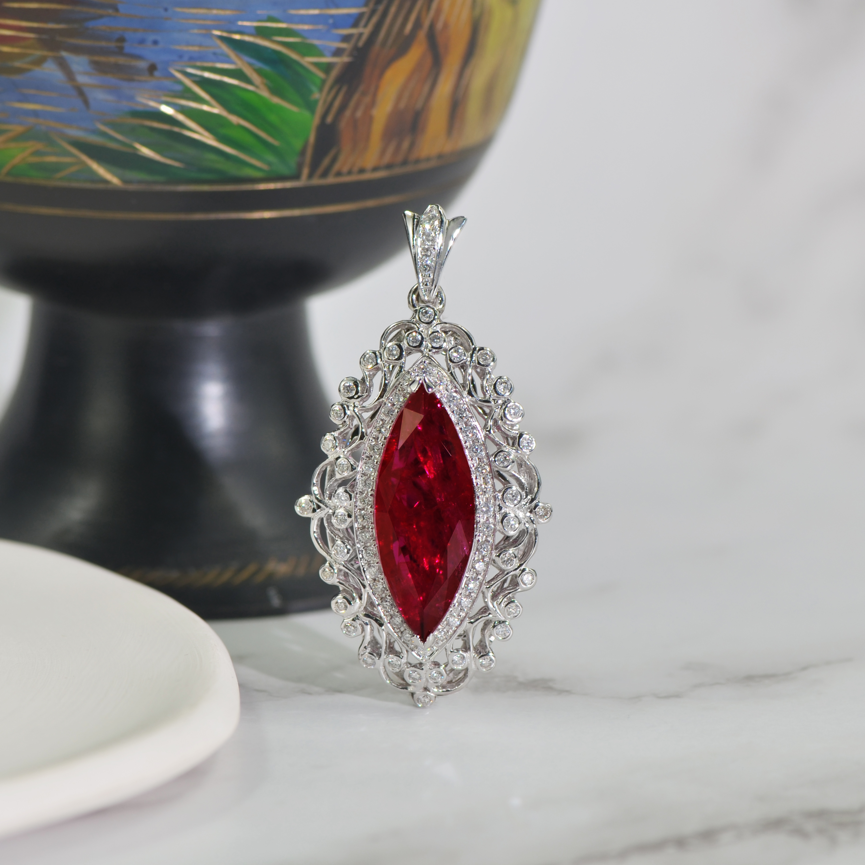 This pendant is made of 18k white gold setting with ruby and diamond. This product is Certified by SuanPhlu.com.
