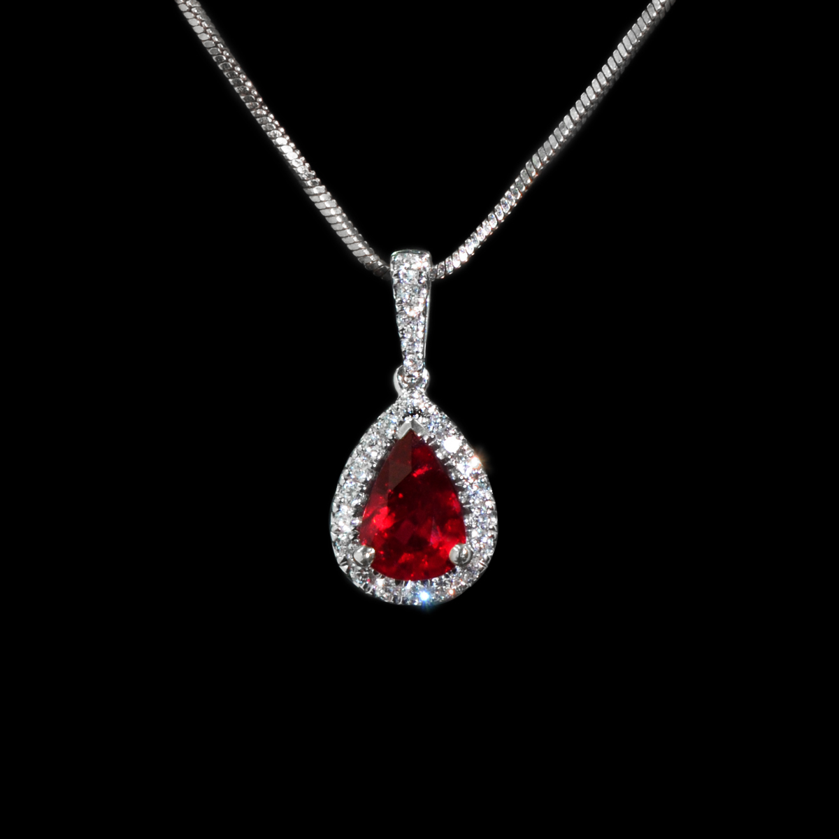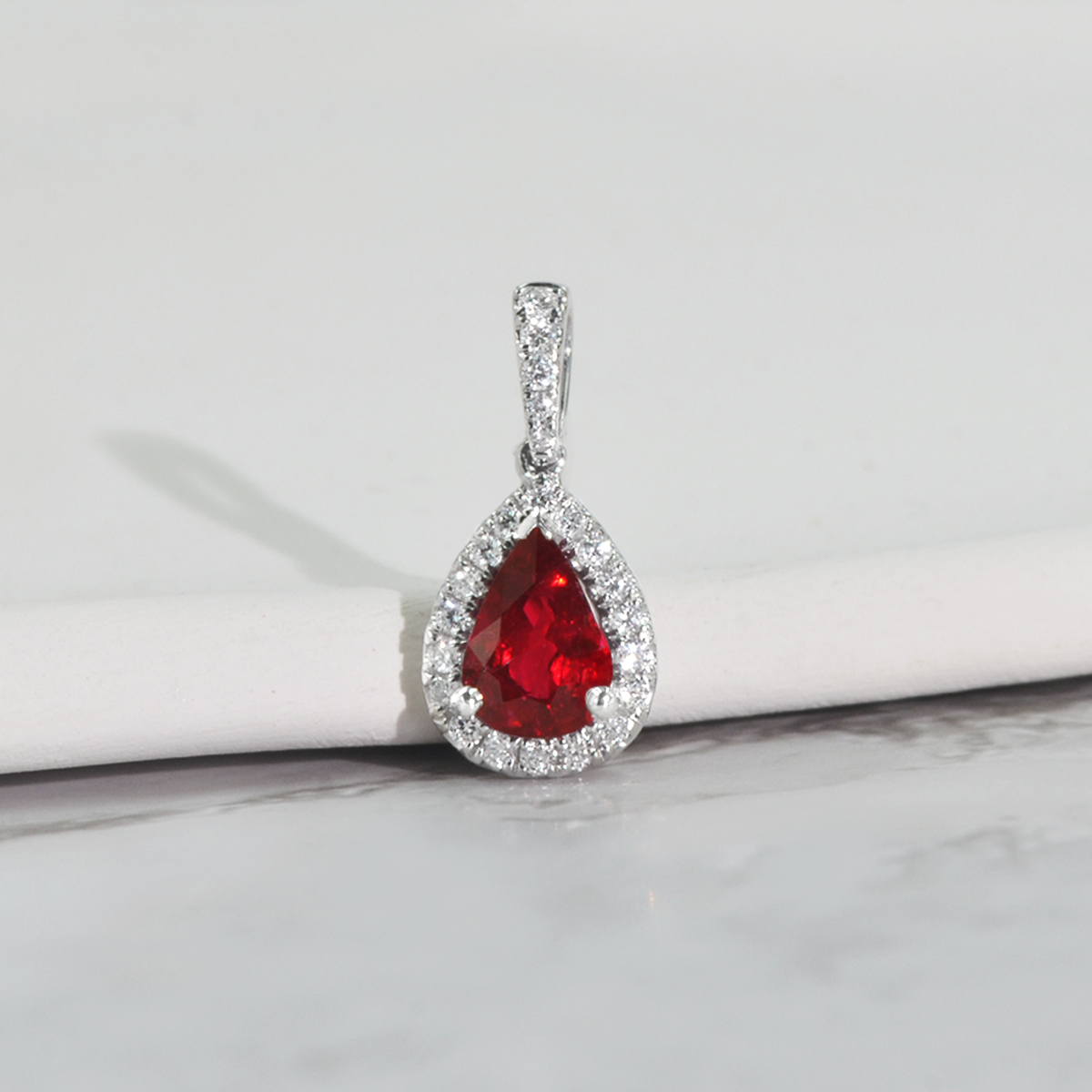 本产品是由18K白金镶嵌天然红宝石和天然钻石制成的红宝石钻石吊坠,