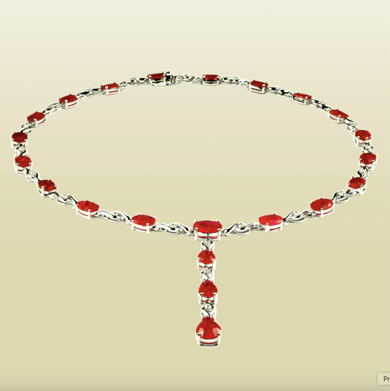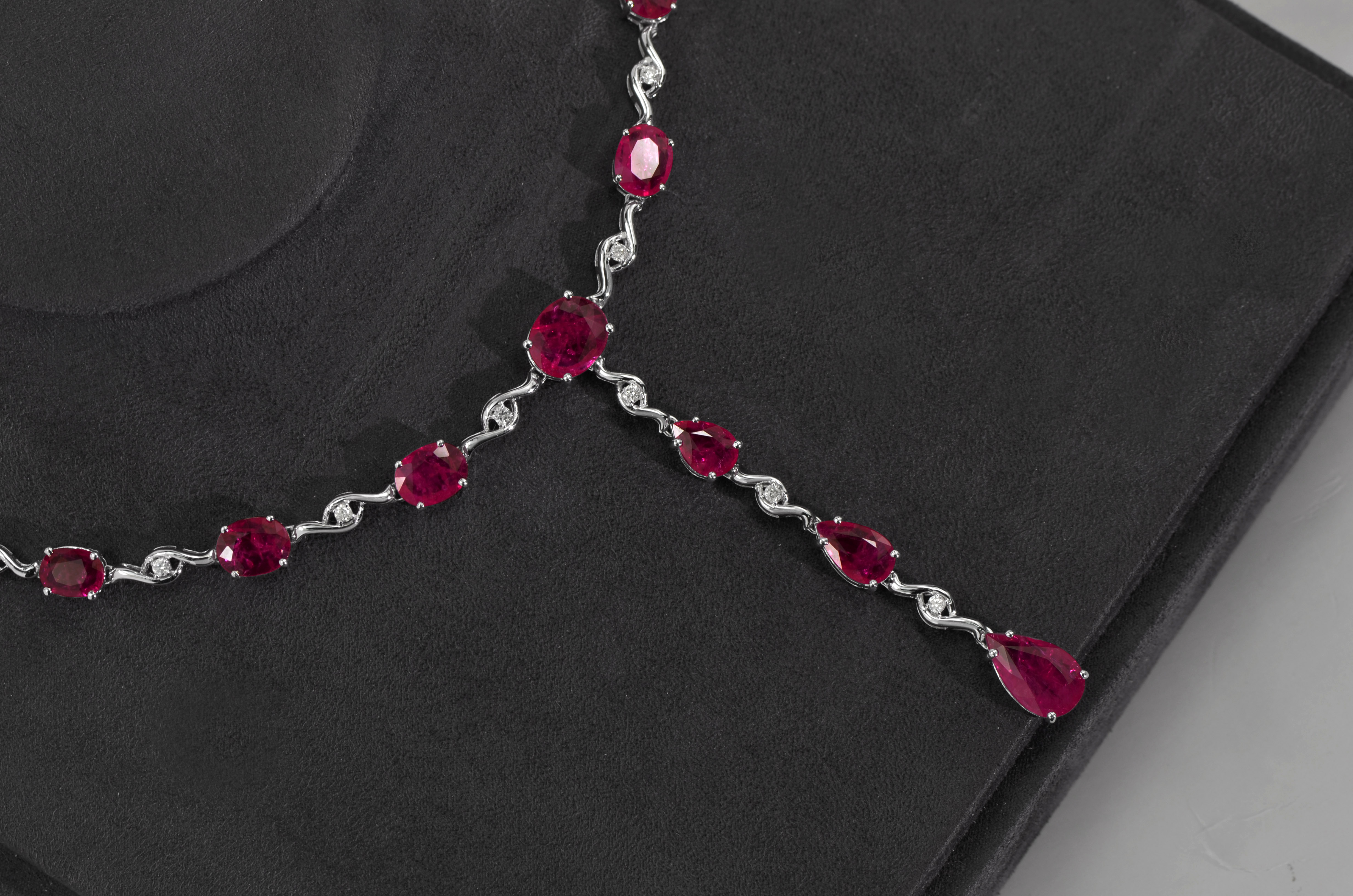 本产品是由18K白金镶嵌天然红宝石和天然钻石制成的红宝石钻石项链, 并配有萱蒲珠宝出具的品质 保证单。