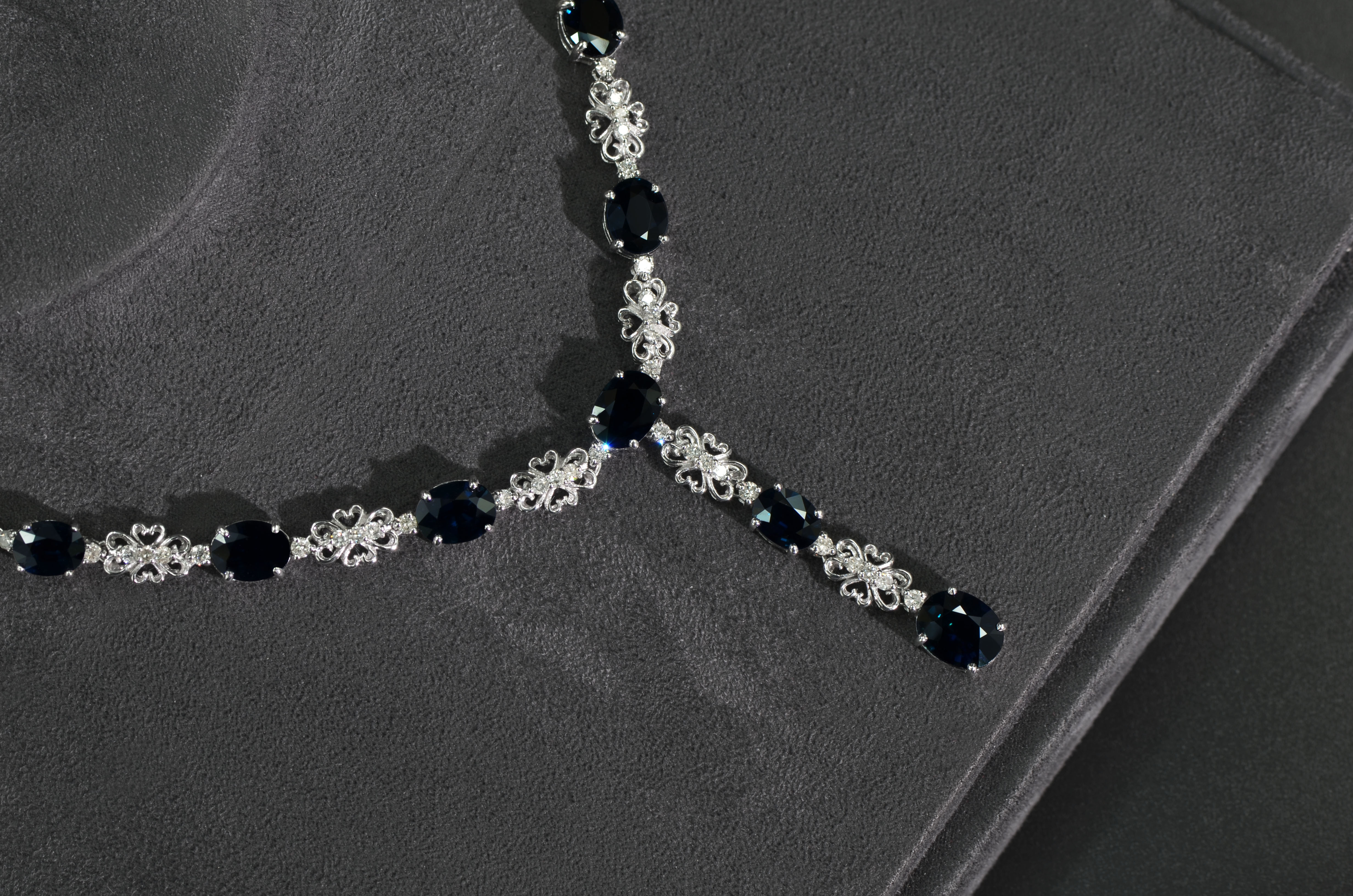 This necklace is made of 18k white gold setting with sapphire and diamond. This product is Certified by SuanPhlu.com.