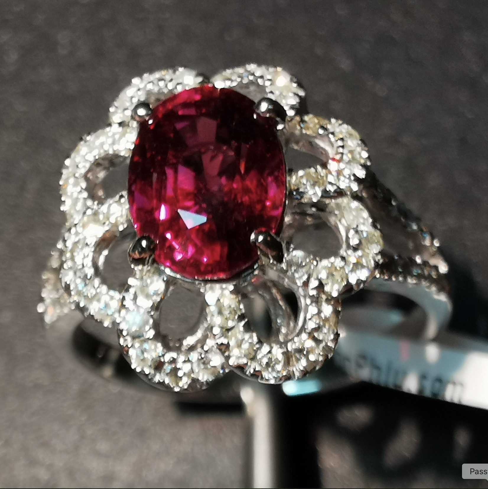 本产品是由18K白金镶嵌天然玫瑰榴石和天然钻石制成的玫瑰榴石钻石戒指, 并配有萱蒲珠宝出具的品质 保证单。