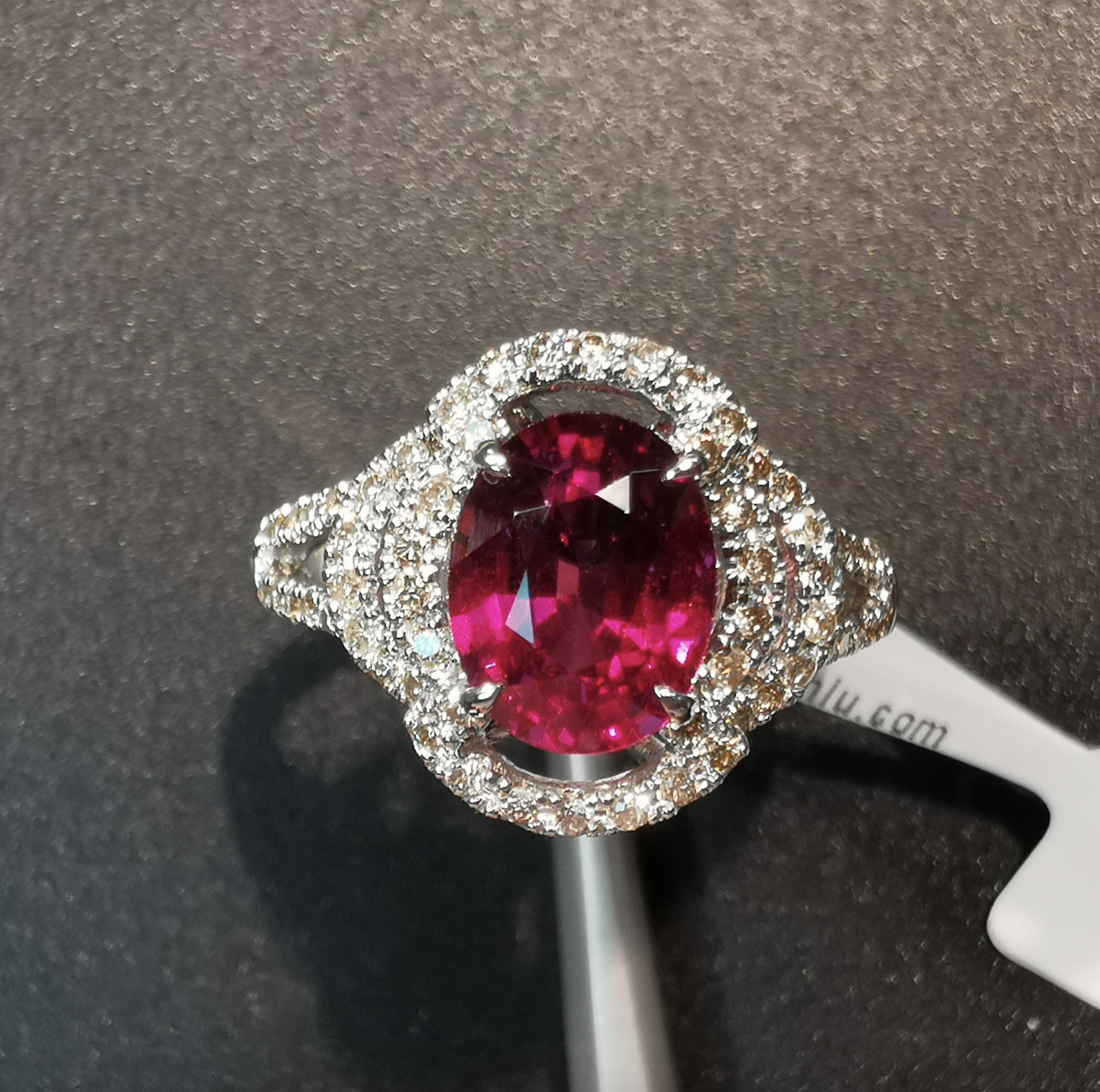 This ring is made of 18k white gold setting with rhodolite and diamond. This product is Certified by SuanPhlu.com.