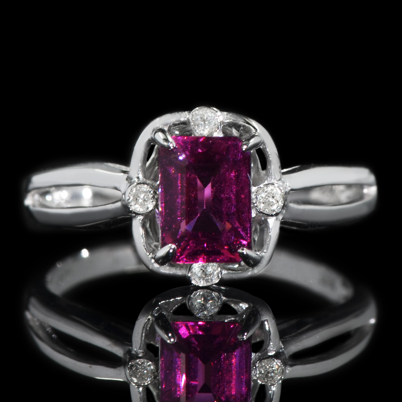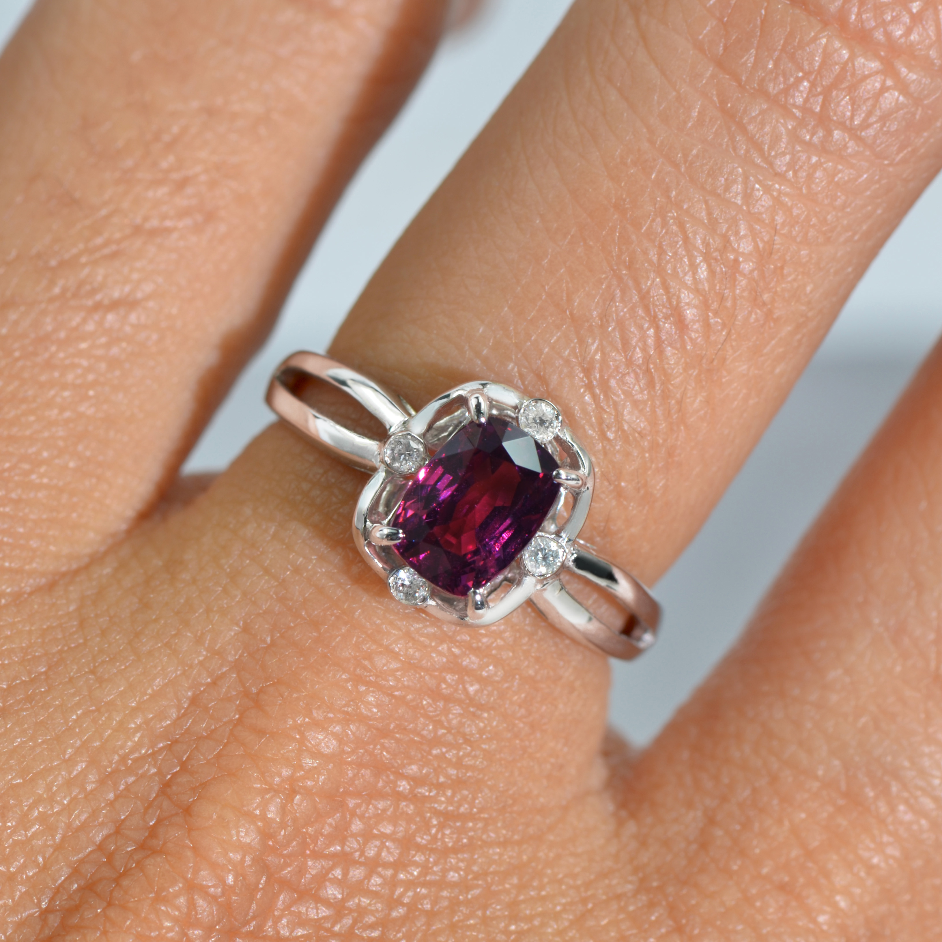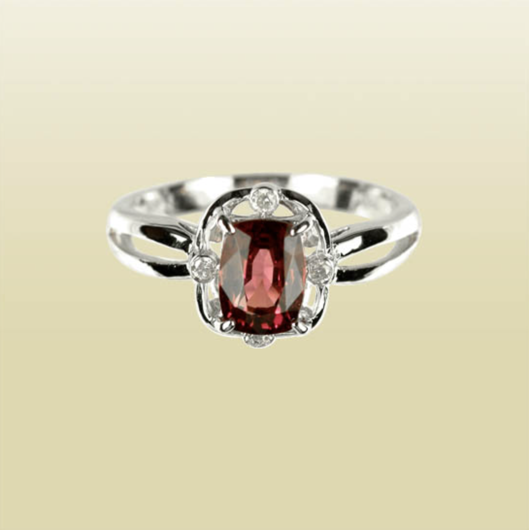 This ring is made of 18k white gold setting with rhodolite and diamond. This product is Certified by SuanPhlu.com.