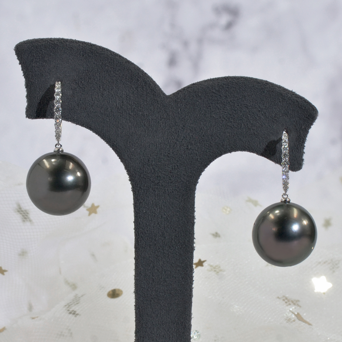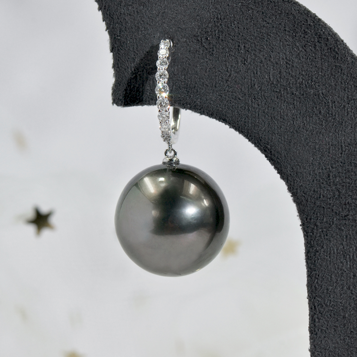 This earrings are made of 18k white gold setting with South Sea (Tahitian) pearl and diamond. This product is Certified by SuanPhlu.com.